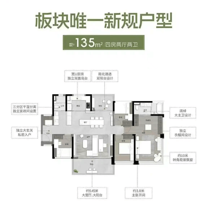 6。 建面约135㎡户型:四房两厅两卫,南北通透双阳台设想,采光通风结果极佳;自带约5。25米大宽厅以及约5。45米大阳台,空间宽阔,可满脚家庭、休闲文娱等多种需求;从卧开间约3。6米,曾经接近不少紧凑三房的客堂开间,空间宽敞舒服,得房率超120%,最高可达138%,适合高端改善家庭。