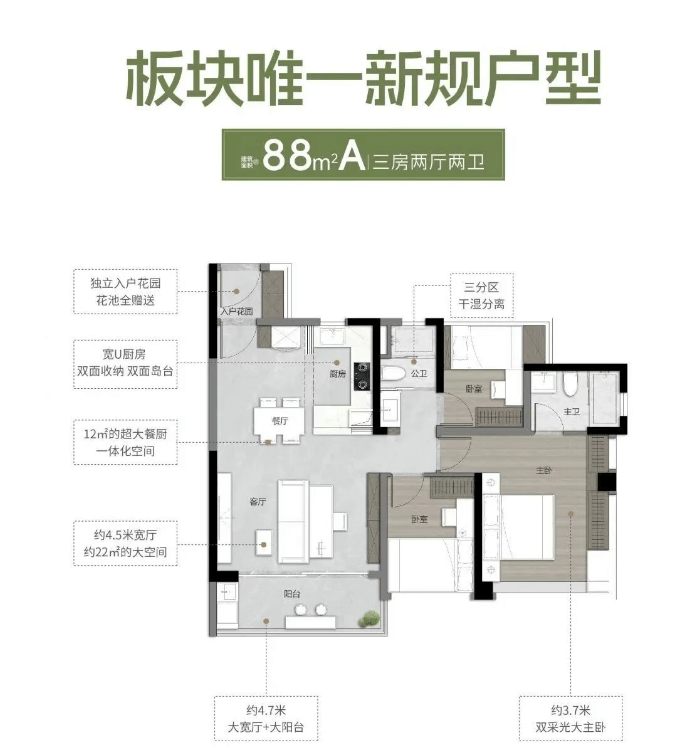 2。 建面约88㎡A户型:三房两厅两卫,有约4。7米大阳台,以及约3。5*4。3米双采光大从卧,采光通风结果极佳;客堂空间宽阔,搭配LDKG一体化设想,让客堂、餐厅、厨房、阳台构成一个宽阔的互动空间,提拔家庭互动体验,得房率超120%,适合刚需偏改善家庭。