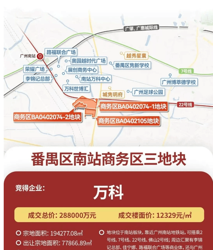 【拿地时间】:2024年12月17日,万科摘得广州南坐商务区三宅地,正式启动万科·檐屿城项目开辟,延续万科正在南坐板块的深耕结构。