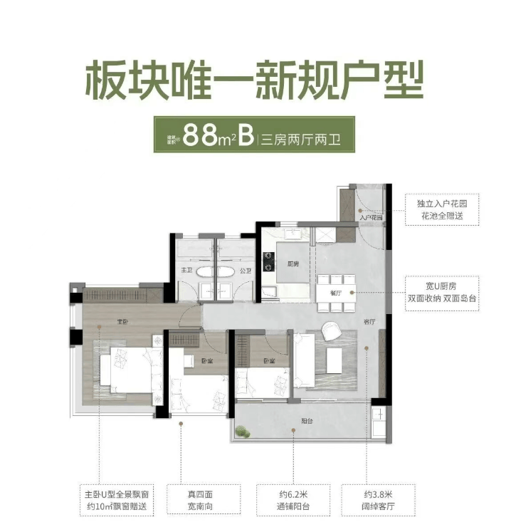 3。 建面约88㎡B户型:南向三房两厅两卫,从卧配备270°飘窗,附带创意设想方案,可打制打扮台、衣帽间等功能空间,满脚业从的个性化需求;客堂开间3。9米,采用厨分手设想,阳台毗连次卧,7。3米通铺阳台,最大化延长室内空间,LDKG一体化设想让空间更通透、适用,得房率凸起,兼顾适用性取舒服度。