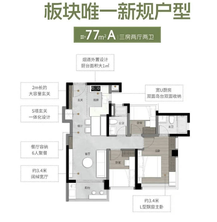 1。 建面约77㎡A户型:三房两厅两卫,三面宽南向,通过270°全景舱从卧设想,提拔栖身舒服度取采光结果;客堂采用LDK公区方案,LDKB一体化客堂和可变空间,是超新规户型的常见设想,最大化操纵空间,得房率凸起,即便小户型也能实现功能齐备,满脚刚需家庭的栖身需求。该户型采用兼具木地板颜值+瓷砖机能的木纹砖,比拟良多小户型采用的通俗瓷砖,更显高端,同时配备全屋躲藏式地方空调、方太厨房三件套、智能马桶等超配交标,提拔糊口质量。